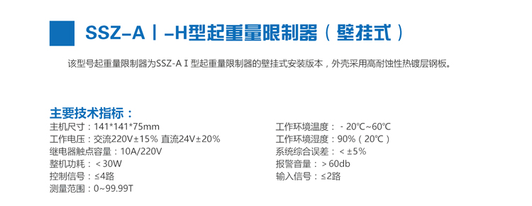 產(chǎn)品詳情 功能介紹 產(chǎn)品優(yōu)勢 產(chǎn)品參數(shù) 包裝清單 產(chǎn)品詳情 該型號起重量限制器為SSZ-A(Ⅰ/Ⅱ)-H型起重量限制器的壁掛式安裝版本,外殼采用高耐腐蝕性防水壓鑄鋁合金。Ⅰ型和Ⅱ型分別適用于一路和兩路信號輸入的起重機(jī)。 功能介紹 產(chǎn)品優(yōu)勢 產(chǎn)品參數(shù) 包裝清單