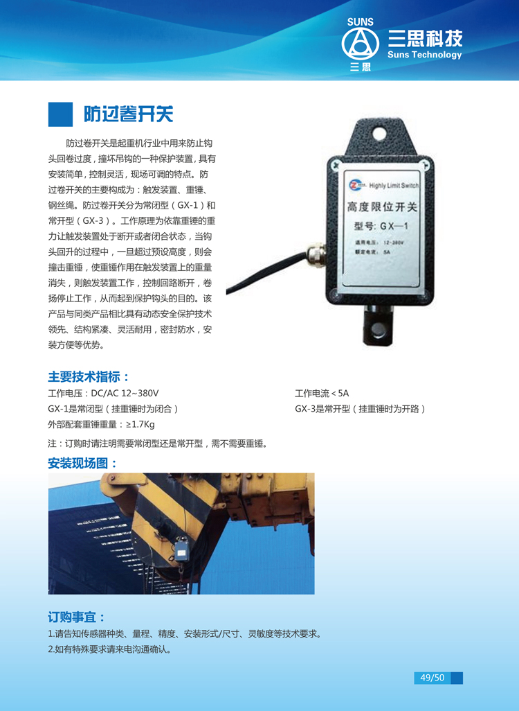 防過卷開關(guān)是起重機(jī)行業(yè)中用來防止鉤頭回卷過度,撞壞吊鉤的一種保護(hù)裝置,具有安裝簡單、控制靈活、現(xiàn)場可調(diào)的特點(diǎn)。防過卷開關(guān)的主要構(gòu)成為:觸發(fā)裝置、重錘、鋼絲繩。防過卷開關(guān)分為常閉型 (GX-1)和常開型(GX-3)。工作原理為依靠重錘的重力讓觸發(fā)裝置處于斷開或者閉合狀態(tài) ,當(dāng)鉤頭回升的過程中,一旦超過預(yù)設(shè)高度,則會撞擊重錘,使重錘作用在觸發(fā)裝置上的重量消失,則觸發(fā)裝置工作,控制回路斷開,卷揚(yáng)停止工作,從而起到保護(hù)鉤頭的目的。該產(chǎn)品與同類產(chǎn)品相比具有動態(tài)安全保護(hù)技術(shù)領(lǐng)先、結(jié)構(gòu)緊湊、靈活耐用、密封防水,安裝方便等優(yōu)勢。