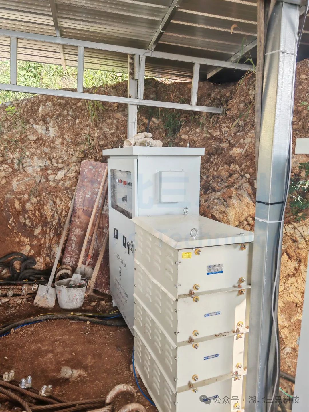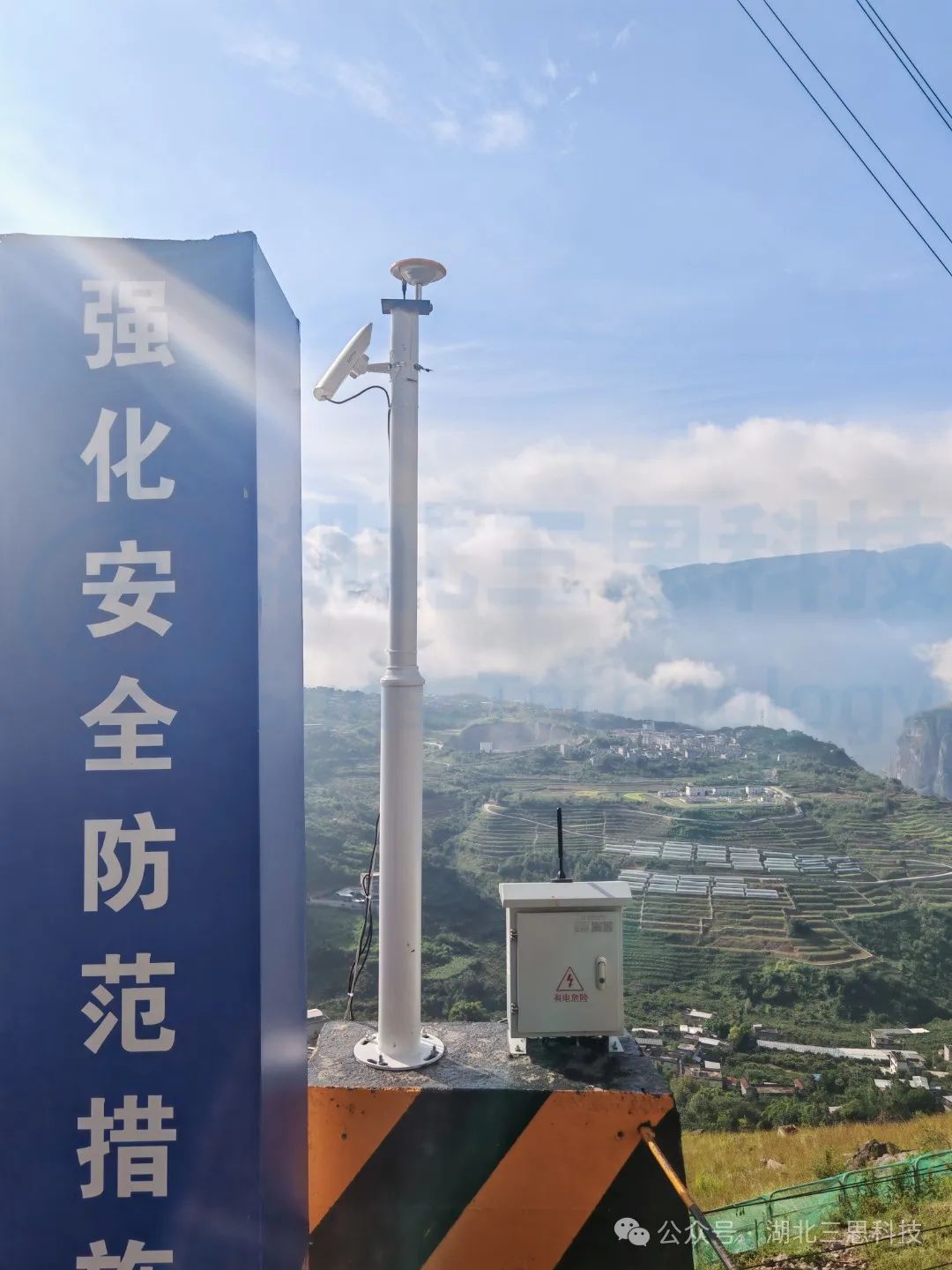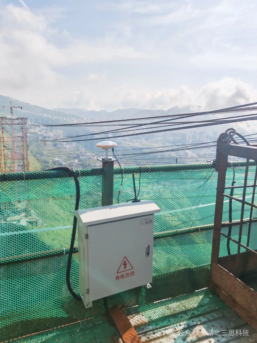 ▲戶外電氣柜、GNSS北斗定位基站、網(wǎng)橋無線傳輸系統(tǒng)安裝完工展示。